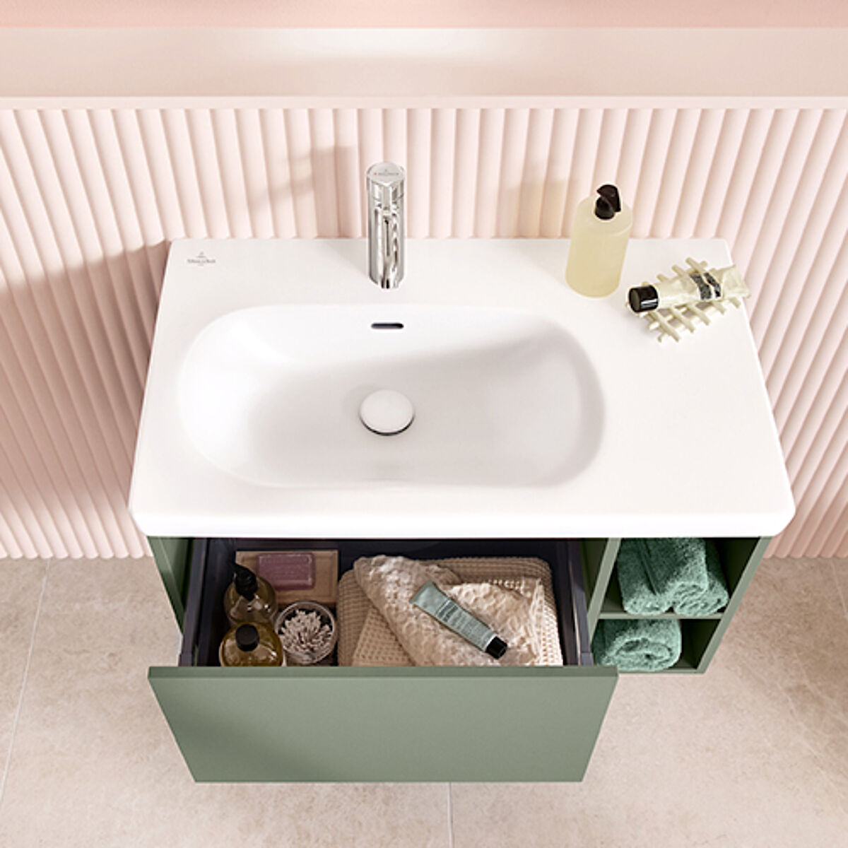 Die Vielseitigkeit von Skyla zeigt sich an der breiten Farbpalette und den flexiblen Größenoptionen. Acht moderne Farbtöne – von klassischem Brillant White über sanftes Soft Green bis hin zu warmem Nordic Oak – eröffnen zahlreiche Möglichkeiten für individuelle Looks. Auch bei den Größen bietet Skyla Spielraum: Mit sechs Varianten (von 55 bis 120 cm) passt sich der Schrankwaschtisch ideal an jede Raumgröße an. Auf Wunsch sind die Unterschränke mit einer oder zwei Schubladen erhältlich, wobei die Modelle in den Breiten 80 und 100 cm zusätzlich mit einem offenen Fach kombiniert werden können – die perfekte Ergänzung zum asymmetrischen Waschbecken.