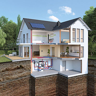 Nutzen Sie die Sonnenenergie gleich doppelt: In der Kombination mit einer Solarthermie-Anlage lässt sich die Solarwärme direkt in den Heizkreiskreislauf einspeisen, in der Regel wird sie in einem Solar­speicher zwischengelagert. Wenn der Solarspeicher gefüllt ist, wird überschüssige Solarwärme zum Beispiel ins Erdreich geführt, so dass dieses nicht zu sehr auskühlt.