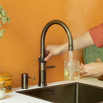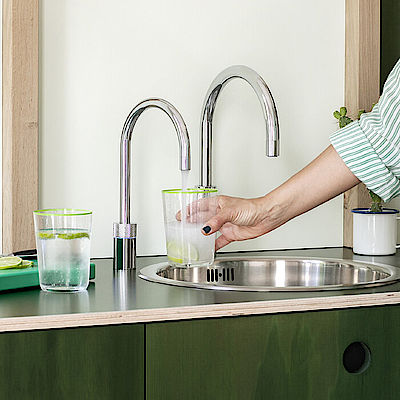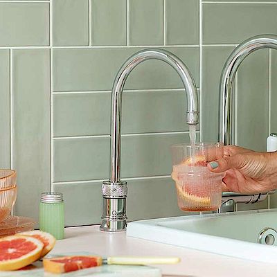 Ein Wasserhahn für alles: 100°C kochendes, warmes und kaltes Wasser mit fünf verschiedenen Oberflächen. Der Auslauf ist sowohl in rund als auch in gerade erhältlich. Optional können Sie den Wasserhahn auch durch den Cube erweitern und erhalten dann auch gekühltes sprudelndes oder stilles Wasser.