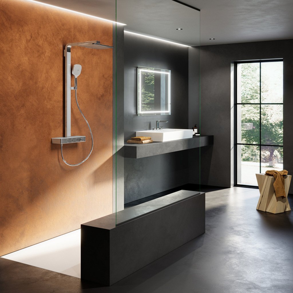 Das Sortiment von Infinity Showers umfasst sieben Artikel für Duschbereich und Badewanne: von der Handbrause über komplette Duschsysteme bis zu Dusch-/Badewannenthermostaten.
